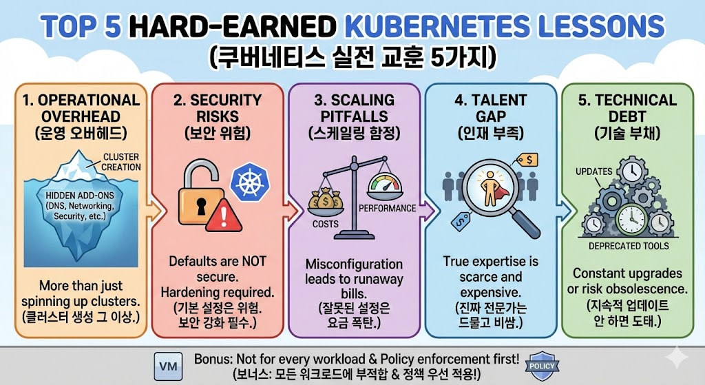 μΏ λ²λ€ν°μ€λ νμ₯ κ°λ₯ν μΈνλΌ λ°°ν¬ λ°©μμ νμ νμ§λ§, κ·Έ μ΄λ©΄μλ λ²€λλ€μ΄ μ μλ €μ£Όμ§ μλ μ΄μμ 볡μ‘μ±κ³Ό λΉμ© λ¬Έμ κ° μ¨μ΄ μμ΅λλ€. μλ κ° μΏ λ²λ€ν°μ€λ₯Ό μ€κ³νκ³ μ΄μν΄ μ¨ μ λ¬Έκ°λ€μ κ²½νμ λ°νμΌλ‘, μ‘°μ§μ΄ μΏ λ²λ€ν°μ€ λμ μ κ²ͺκ² λλ 5κ°μ§ ν΅μ¬ κ΅νμ μ 리νμ΅λλ€.