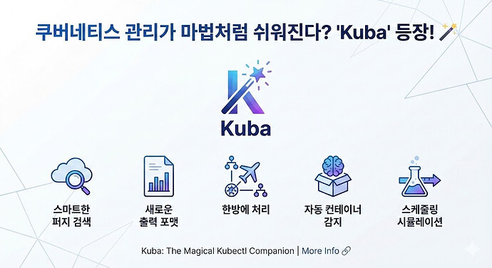 Kuba๋ kubectl์ ๋ ํจ์จ์ ์ด๊ณ ์ง๊ด์ ์ผ๋ก ํ์ฉํ ์ ์๋๋ก ์ค๊ณ๋ CLI ๊ธฐ๋ฐ ๋ํผ(wrapper) ๋๊ตฌ์