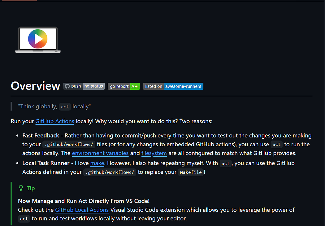 클라우드에서 GitHub Actions를 디버깅하는 일이 느리고 번거로울 수 있습니다. Act는 이를 로컬 터미널에서 Docker를 활용해 실행할 수 있게 해줍니다. 덕분에 작은 변경사항마다 GitHub에 푸시하지 않고도 CI/CD 파이프라인을 테스트할 수 있습니다.