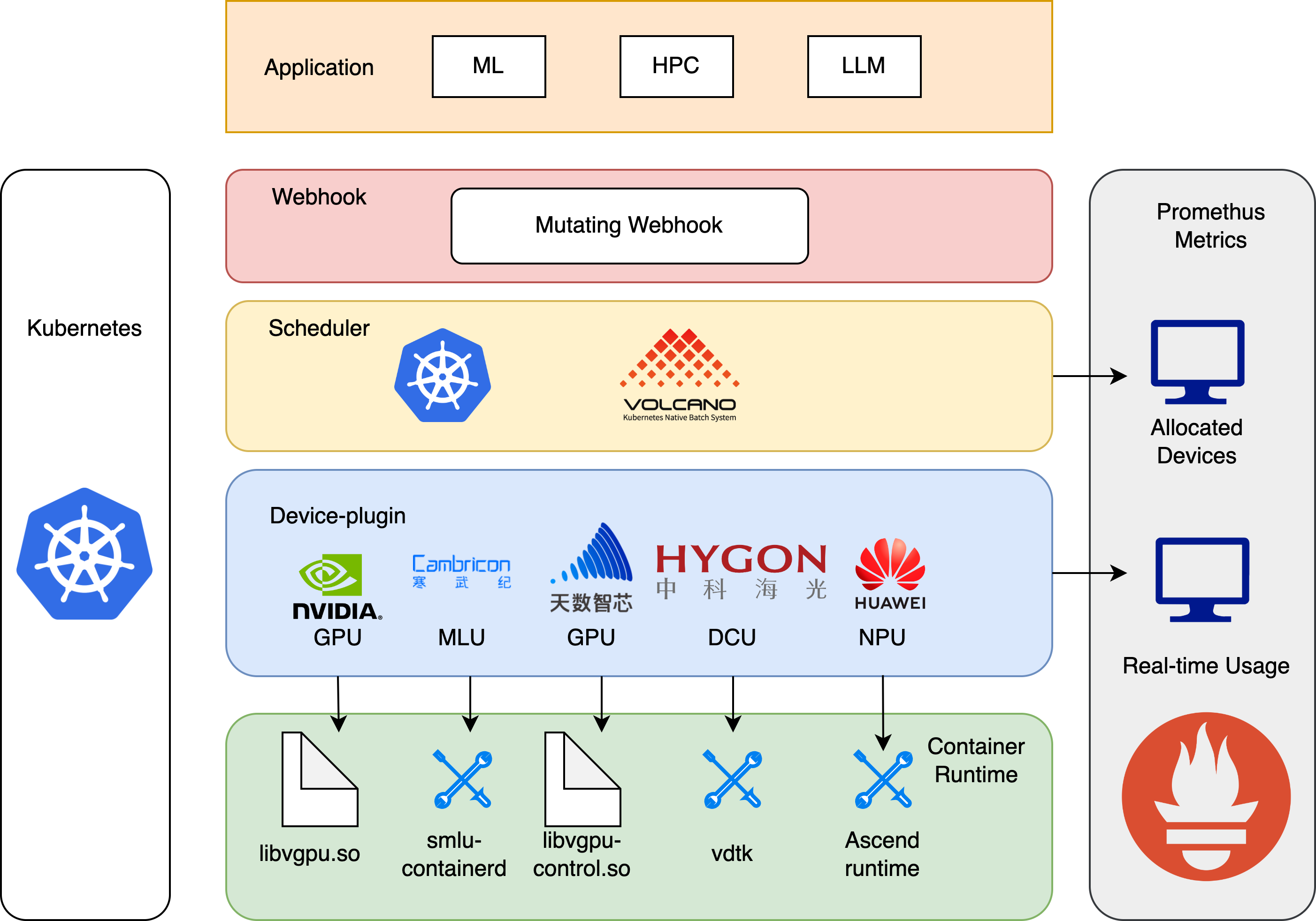 HAMi(Heterogeneous AI Computing Virtualization Middleware)๋ โallโinโoneโ Helm ์ฐจํธ ํํ๋ก ์ ๊ณต๋๋ฉฐ, Kubernetes ๋ค์ดํฐ๋ธ API๋ฅผ ๊ทธ๋๋ก ์ฌ์ฉํด ๋ณ๋ ๋ณ๊ฒฝ ์์ด ์ฆ์ ๋์