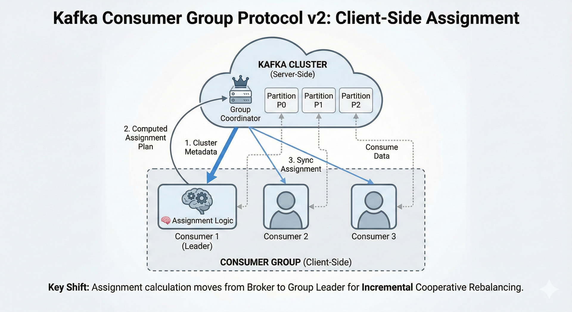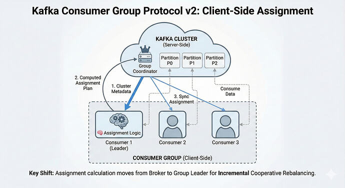 다시 말해, Consumer Group Protocol v2는 **“클라이언트 중심의 할당(Client-side Assignment)”**과 **“점진적 리밸런싱(Incremental Rebalancing)”**을 보여줍니다.