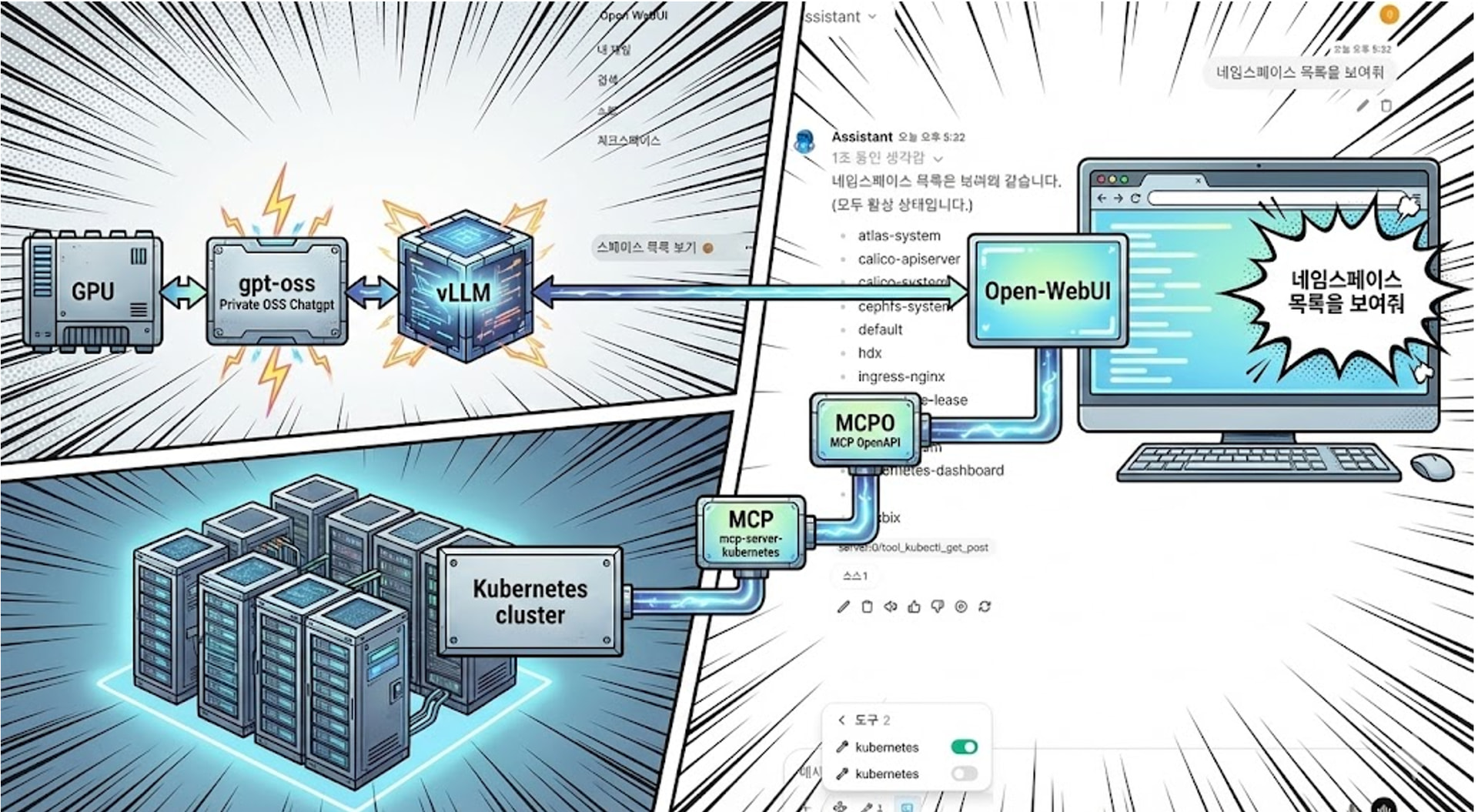 안녕하세요. 지난 8월 공개된 gpt-oss 모델을 기반으로 vLLM과 MCP를 활용하여 ‘나만의 AI Chat’ 환경을 구성해 본 내용을 공유해 드리려고 합니다. 단순히 모델을 띄우고 채팅 환경을 구성하는 것을 넘어, 실제로 LLM이 외부 도구(Kubernetes 등)와 상호작용할 수 있도록 구성해 보았는데요. 어떤 기술들을 사용했는지 처음 접하시는 분들께 도움이 되었으면 좋겠습니다.