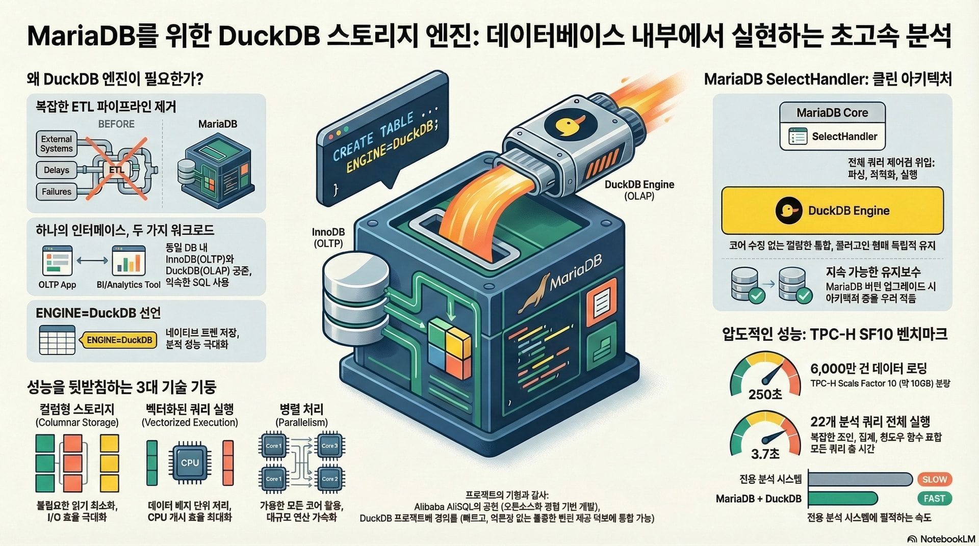 이 통합의 기술적 정점은 MariaDB의 SelectHandler 인터페이스 활용에 있습니다. 이는 과거 Alibaba의 AliSQL 8.0(2025년 12월 공개)이 DuckDB를 통합하기 위해 서버 코어의 상당 부분을 수정(Core Hacks)해야 했던 방식과 확연히 차별화됩니다.