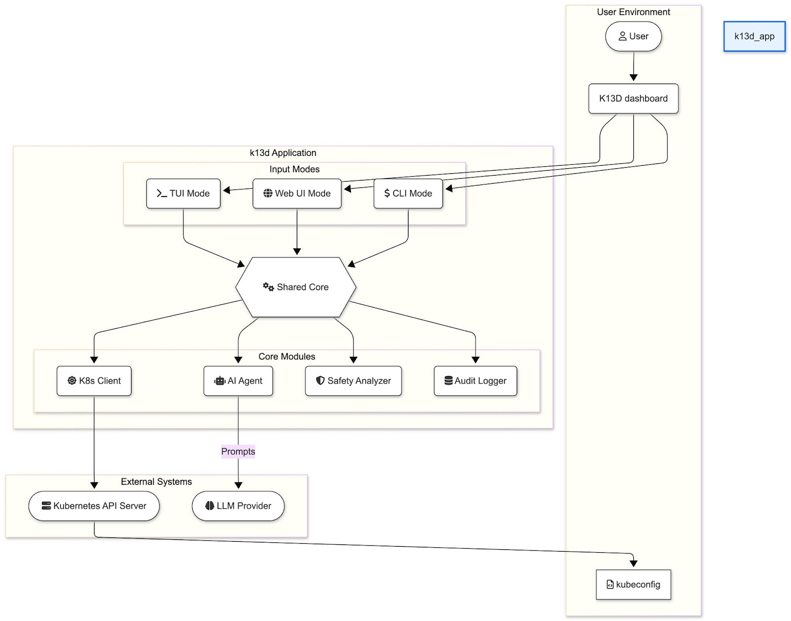 Context-Aware AI: Moving beyond simple command generation, k13d injects real-time AI contextโincluding resource status, event logs, and metricsโdirectly into the workflow. This allows for the most accurate diagnosis when asking critical questions like, โWhy did this pod crash?โ -